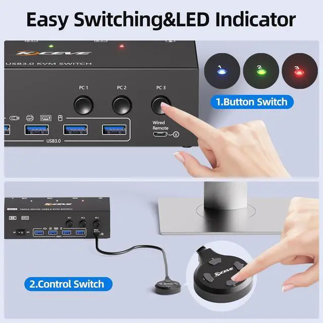 Easily Switch -2 Switching MethdosMethod 1:Switch via the panel buttons on our KVM switch.Method 2:With the wired extension button,you can switch signal sources via the button even if the KVM is placed away from the work area,keeping the desktop tidy and reducing cable clutter.