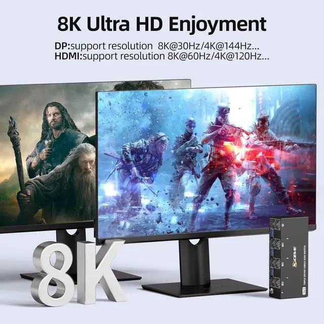 Ultra 8K 3 Monitor KVM8K 2 Displayport HDMI KVM Switch 3 monitors 3 computers resolution 8K/4K and backward compatible with lower resolution,it offers ultra-high definition imagequality,a feast for your eyes.(HDMI port: 8K@60Hz/4K@120Hz,DP port: 8K@30Hz/4K@120Hz )Note: Please use HDMI2.1 and DP1.4 cables,the length of cabels more short more better.