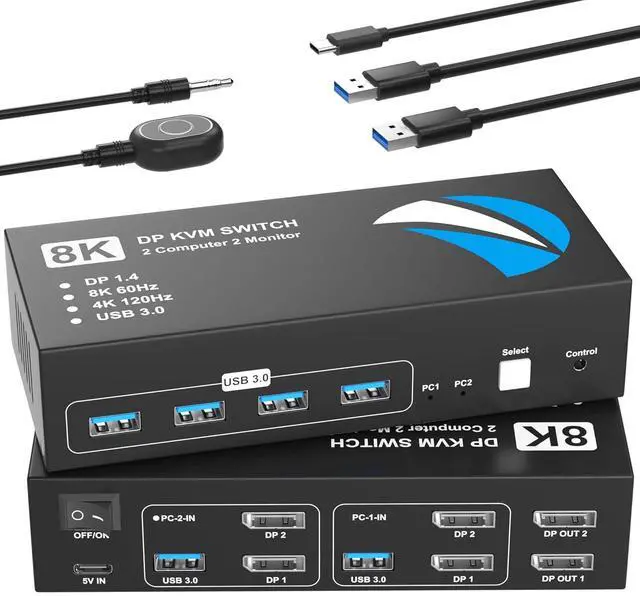 Important Notices1. Please make sure each of your computers has 2 display port and 1 USB-A port, and that all ports are connected correctly. Docking stations and additional adapter cables are not supported 2. Each computer must support dual-display output simultaneously. Test method: Connect the computer directly to two monitors without using the KVM switch. 3.Many macOS laptops do not have the DisplayPort port, and therefore are not compatible with this product. 4.New monitors often have multiple DP input ports, please select the correct input source in the monitor settings. Package Contents KVM Switch×1, USB 3.0 Cable×2, USB Power Cable×1, Wired Desktop Controller×1, User Manual×1.