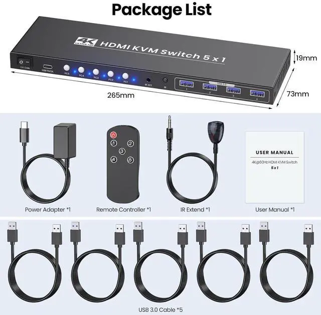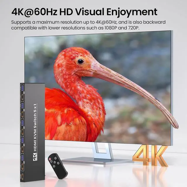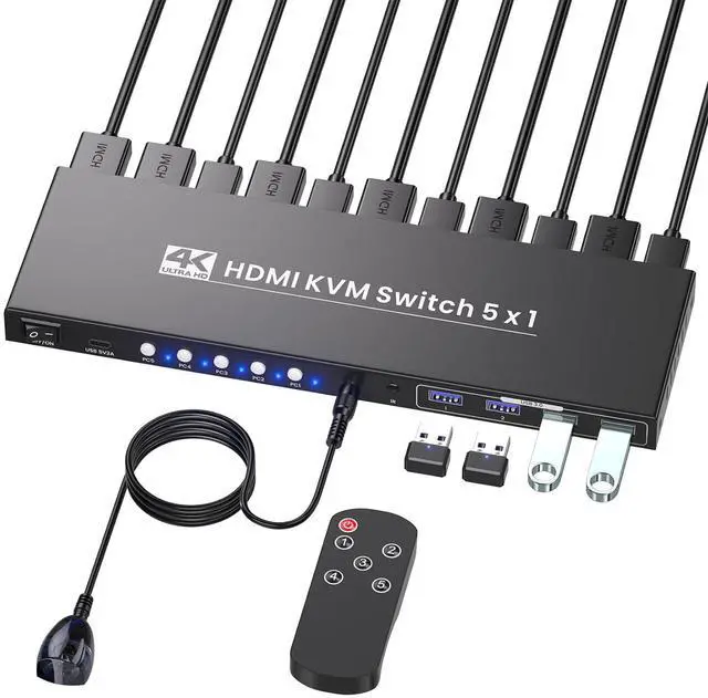 Lets face itmanaging 5 computers with separate monitors, keyboards, and mice is a nightmare of tangled cables, constant plugging/unplugging, and a cluttered desk that kills productivity. But this 5 Port HDMI KVM Switch is here to turn chaos into calm: it lets you control up to 5 computers with just one set of peripherals and a single monitor, all while serving up stunning 4K@60Hz visuals, blazingly fast USB 3.0 connectivity, and two hassle-free switching modes.