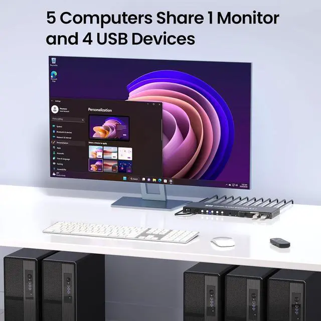 Integrated with a 4-port USB 3.0 hub, this KVM switch 1 monitor 5 computers makes sharing peripherals a breeze. Connect printers, external hard drives, USB storage, or webcams, and enjoy lightning-fast data transfer speeds (up to 5Gbps) that outpace older USB standards. No more disconnecting and reconnecting devicesyour peripherals work seamlessly across all 5 computers.