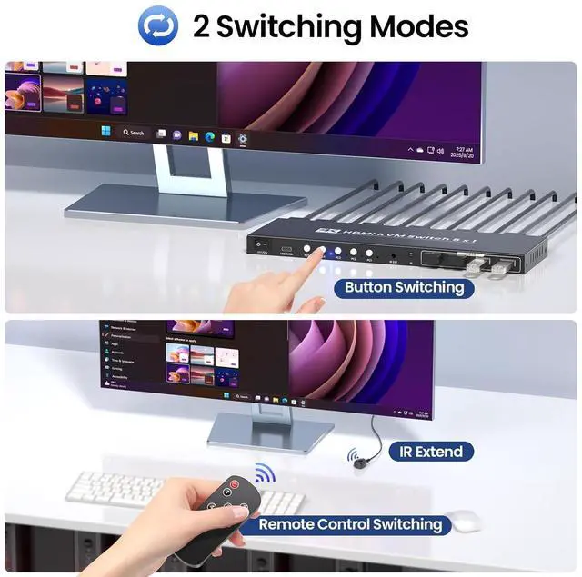Second, the IR remote controller lets you toggle between computers without stretching behind your monitor or digging under your deskideal if youve tucked the KVM switch out of sight to keep your workspace neat. With this KVM switch, switching devices takes just a split second, so you can stay focused on your work, game, or project without interruptions.