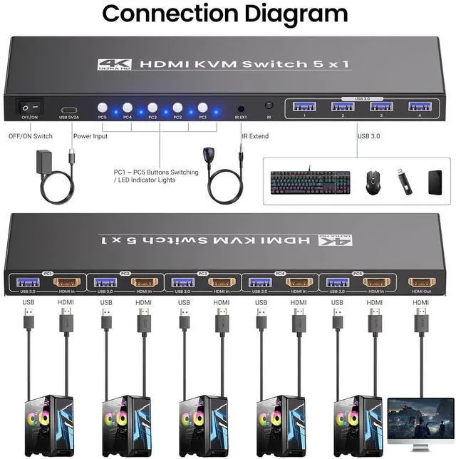 5 Port HDMI KVM Switch 4K@60Hz - Control 5 Computers with 1 Monitor, Keyboard & Mouse + 4-Port USB 3.0 Hub Manage 5 Computers with One Setup 4K@60Hz Ultra HD Visuals Crisp, Smooth, and Vivid USB 3.0 Hub Blazing-Fast Transfers & Peripheral Sharing Two Effortless Switching Modes Control at Your Fingertips Connection Diagram Power ON/OFF Switch & 5V2A Stable Power Supply Power ON/OFF Switch