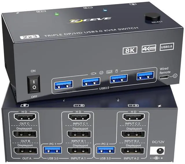 - .Both computers need two DP ports, one HDMI port, and one USB-A output port. .Of your three monitors: two require DP ports, one requires an HDMI port. .For the KVM switch, use short cables compliant with DP 1.4 and HDMI 2.1 standards