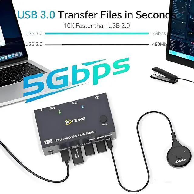 . 3 monitors kvm switch features 4 USB 3.0 ports for connecting keyboards, mice, USB drives, printers, USB cameras, and other USB devices. Data transfer speeds reach up to 5Gbps, reducing wait times and boosting productivity. 4 monitors kvm is also compatible with USB 2.0 devices.
