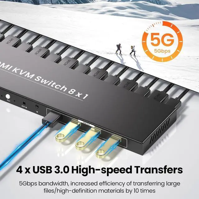 4 USB 3.0 Ports 5Gbps Blazing Transfer SpeedsThis 8 port KVM switch isnt just about video and controlits also a powerful connectivity hub, featuring 4 USB 3.0 Type-A ports that deliver transfer speeds up to 5Gbps. Thats exponentially faster than USB 2.0, meaning you can move large files (like 4K video projects, photo libraries, or backup drives) between your 8 computers in seconds. Hook up an external SSD, printer, scanner, gaming controller, or wireless dongle to the kvm switch, and every computer will have instant access to it.