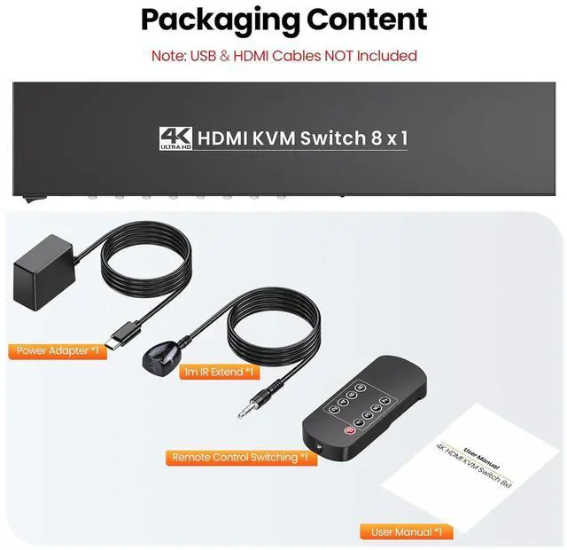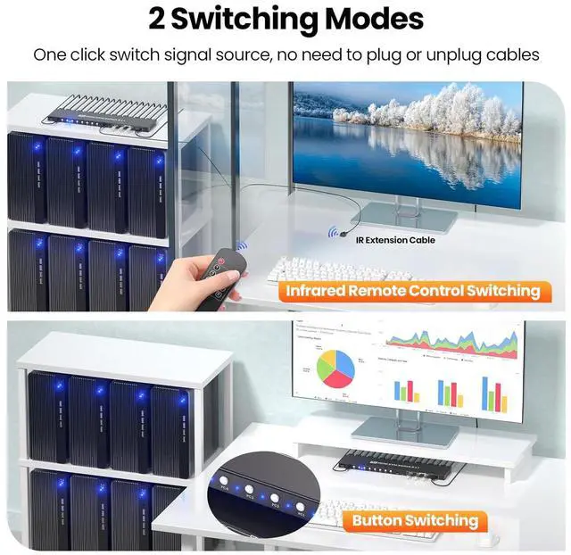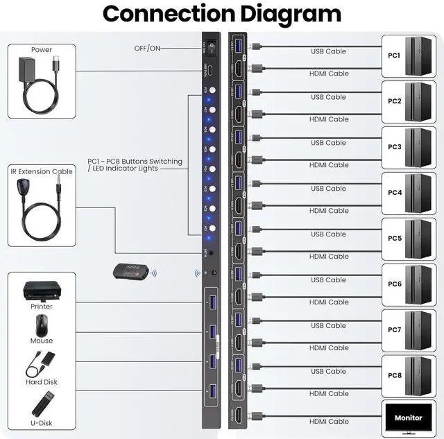HDMI KVM Switch 1 Monitor 8 ComputersConnect 8 computers to one monitor, one keyboard, and one mouse, and take full control of each device without swapping cables, rearranging your desk, or investing in extra gear. This KVM switch 1 monitor 8 computers eliminates the clutter of 7 extra monitors, keyboards, and mice, freeing up desk space and reducing visual distractions that kill focus. It turns multitasking into a seamless experience, saving you time on setup and letting you stay in the zone whether youre working, creating, or playing. This KVM switcher isnt just convenientits a game-changer for anyone who needs efficient access to multiple devices daily.
