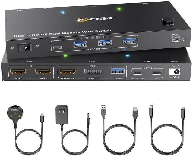 KVM Switch 2 Monitors for 1 Desktop and 1 LaptopThe KCEVE KVM Switch Dual Monitor HDMI enables you to control both a laptop and a desktop computer with just one set of mouse and keyboard, while also sharing compatible devices like a U-disk, scanner, printer, or webcam. Simply press "Windows+P" to choose between mirror / extended screen mode. This KVM Switch 2 Computers 2 Monitors USB C is the ideal choice for offices, business seminars, home theater, multimedia teaching, and gaming