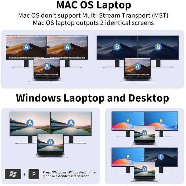 KVM Switch USB C with MSTWith the MST feature, connect just one Type-C cable from your laptop to this KVM switch USB C to expand to two different HDMI displays. Mac computers only support mirroring screens. For the desktop PC, connect it using 1 HDMI + 1 DisplayPort + 1 USB 3.0 cable to the KVM Switch desktop laptop(USB C to HDMI adapters are supported). This Dual monitor KVM Switch USB C complies with HDMI 2.0, DisplayPort 1.4, Type-C 3.1, and USB 3.0 standards