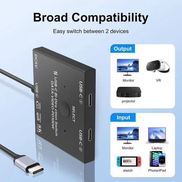 USB C Switcher 1 in 2 Out/2 in 1 Out: - This USB C kvm switches allows 2 USB-C video sources to share a USB-C Monitor or 1 source share 2 displays. Such as laptops, tablets, mobile phones, and game consoles in this BI-DIRECTIONAL way