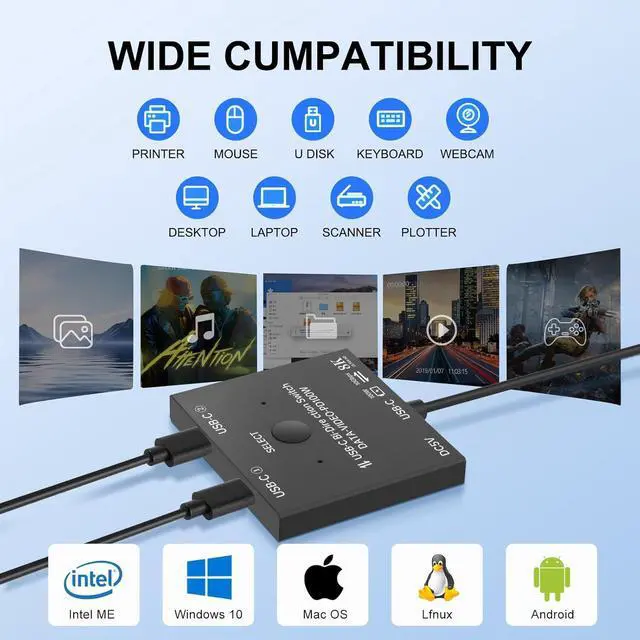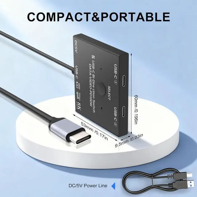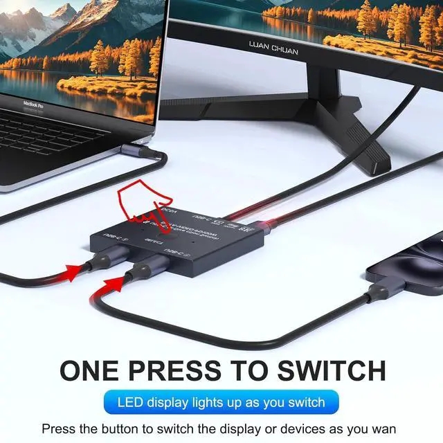 One-Click Switch:USBC switch with Button and LED indicator lights, you can easily switch between 2 computers by a single click on the button, and the LED indicators make it easy to know which computer is in control. Bi-directional connection mode, you can flexibly use this button to switch between the devices you want