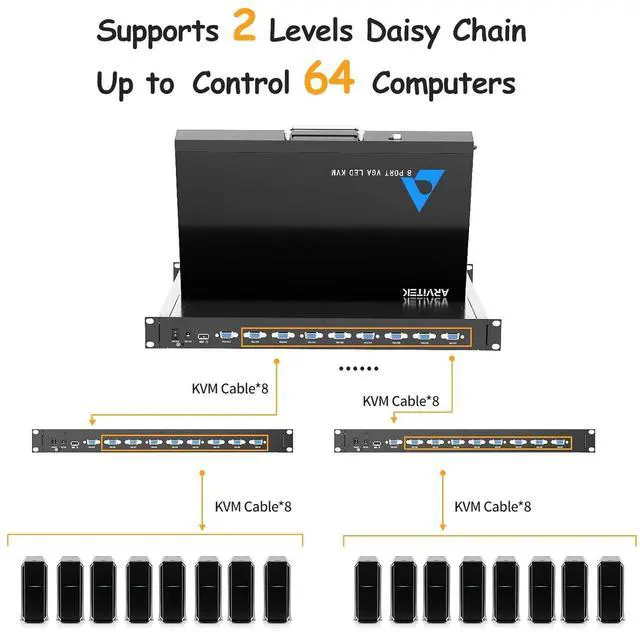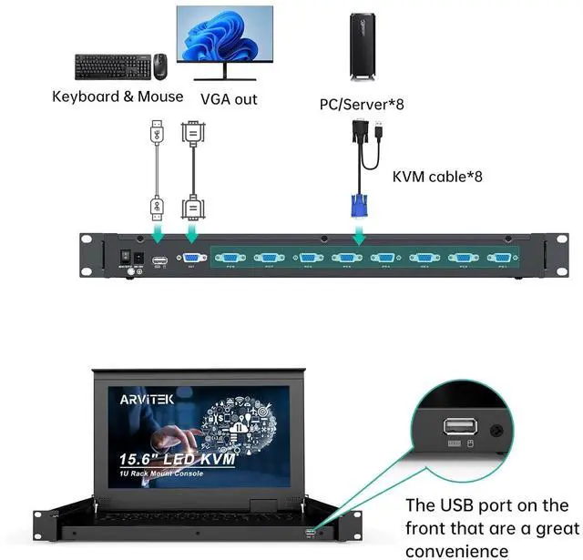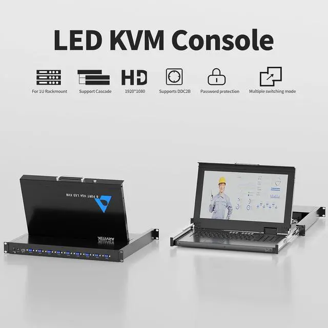 [VGA KVM Console with monitor] Get streamlined, centralized control for up to 8 computers from a single 1U console. Features a bright 15.6-inch LCD screen with a crisp 1920x1080p resolution, compact design saves space and simplifies cable management, ideal for data centers, server rooms, and IT labs.