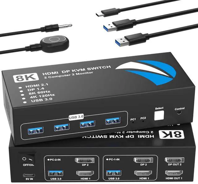 Two Ways of SwitchingThe KVM switch HDMI Displayport offers flexible and convenient switching methods, including a physical button on the main unit and a wired desktop remote controller, making it easy to switch between two connected computers. The physical button ensures intuitive operation with minimal risk of accidental input and the wired desktop remote allows quick switching without touching the main unit. Please Note: Keyboard hotkey switching is not supported.