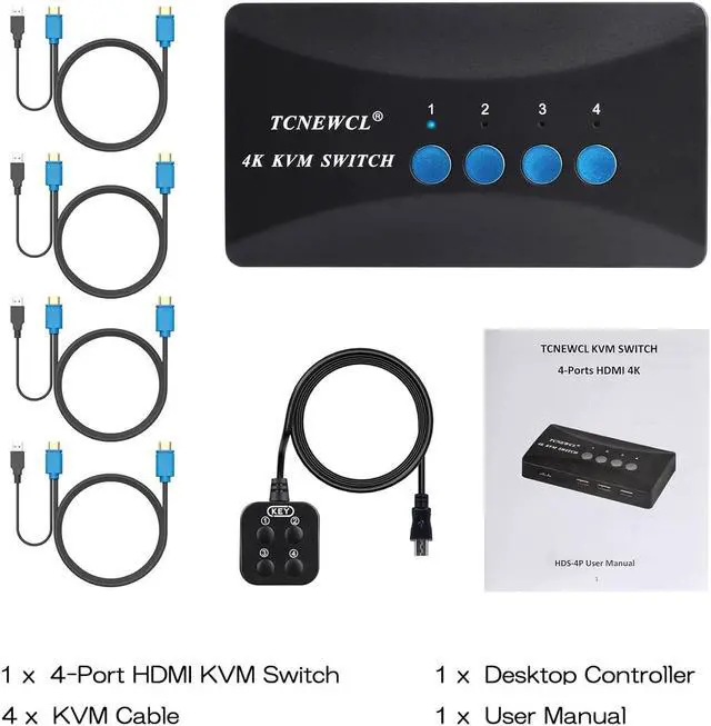 Package and DescriptionThe HDMI KVM switch Comes with 4* 2-in-1 professional hdmi/usb KVM cables, so there is no need to buy additional KVM cables. You will receive 1 KVM switch, 4 KVM cables, 1 desktop wired controller, 1 user manual.
