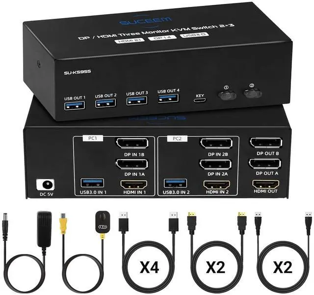 Complete PackageThe package includes everything you need for seamless setup: 1*KVM Switch, 4*DP 1.4 Cables, 2*HDMI 2.1 Cables, 2*USB 3.0 Cables, 1*Wired controller, 1* Power adapter, 1*User manual.