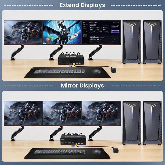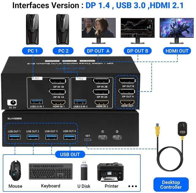 Three MonitorsKVM switch allows 2 computers to share 3 monitors ( 2 DP and 1 HDMI )and 4 USB 3.0 ports, such as mouse, keyboard, printer, U disk, etc. It also support extended and copy mode display. Note: Please make sure your computers have DP and HDMI ports, if not, you might need to use a docking station or other adapter for this function.