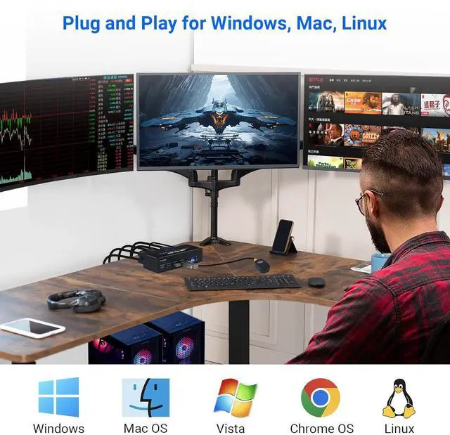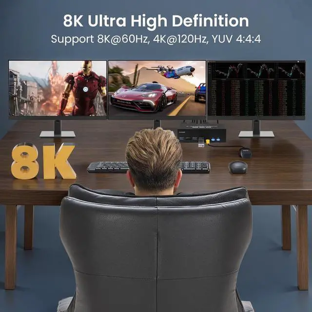 8K60Hz / 4K120HzKVM switch supports up to 8K@60Hz / 4K@120Hz, and is backward compatible with 2K@144Hz, 1080P, 720P etc. Brings you realistic visual enjoyment. Supports connect sources with different resolutions, and automatically identify the resolution when switching the signal source. Note: If you want to achieve the 8K@60Hz, please ensure the signal source, monitor and cables support 8K ( DP1.4 or HDMI 2.1 version).