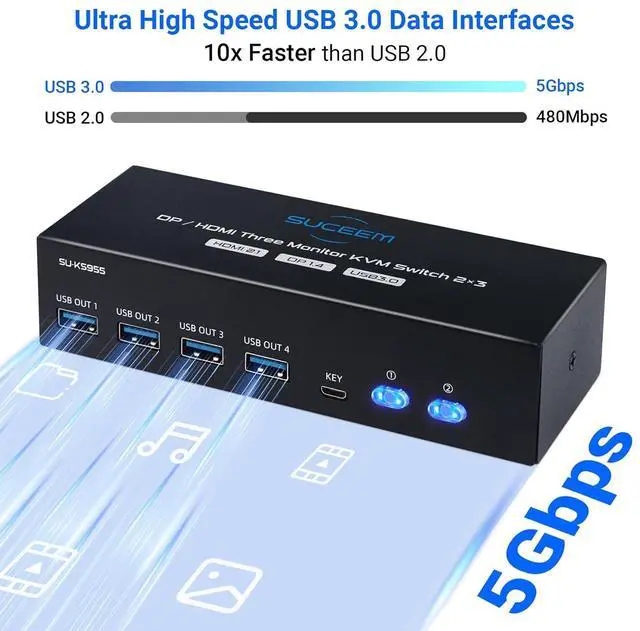 USB 3.0KVM switch with 4 USB 3.0 output ports, can provide a transmission speed of up to 5Gbps, 10x faster than classic USB 2.0 ports, compatible with most of USB devices. Support Windows/Vista/XP, Mac OS, Linux and Unix system. Note: Each computer needs to have 1 USB 3.0 cable connected to the KVM switch, otherwise the keyboard and mouse will not be recognized.