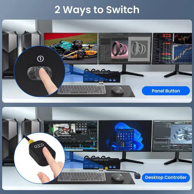 Easy SwitchThe wired desktop controller is included. You can easily switch between 2 computers using the switch button or wired desktop controller, the LED indicator will show the incoming devices.