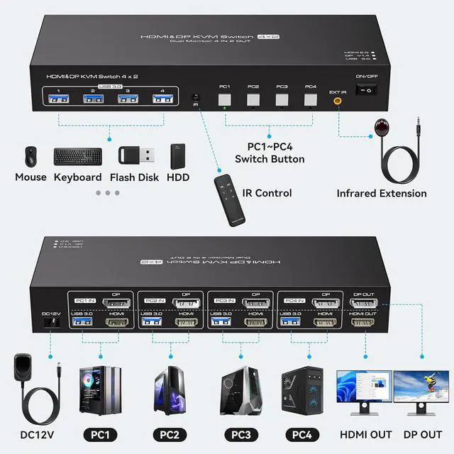 4 port kvm switchThis kvm switch 4 computers 2 monitors allows 4 computers to share 4K dual displays and 4 USB 3.0 devices. You can control the computers or laptops and single or dual displays directly with one set of keyboard and mouse. It's plug and play, with one-touch switching, greatly improving your work efficiency.(Please note: This device requires each of your computers to contain HDMI+DP ports, requiring one of your monitors to contain a DP port and one to contain an HDMI port.)
