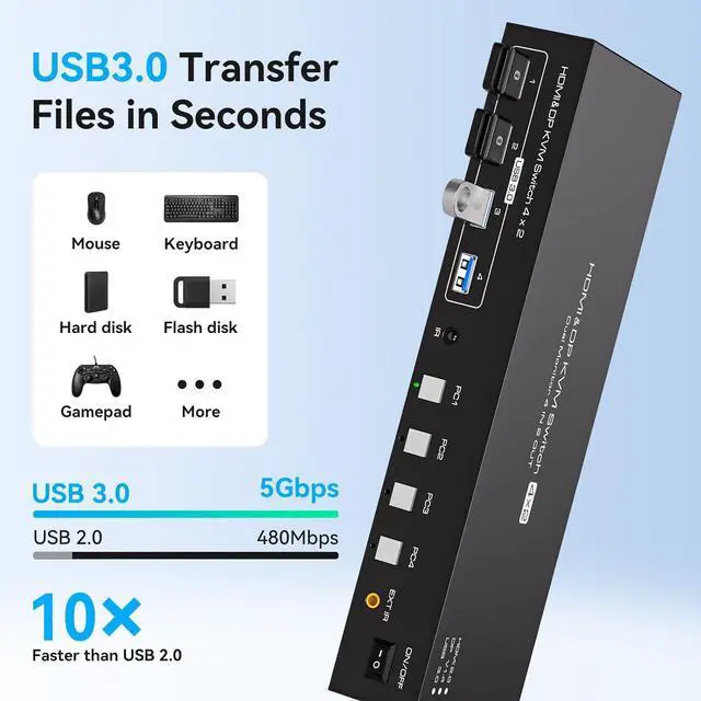 With 4 USB 3.0 PortsThe dual monitor kvm switch is equipped with 4 standard USB 3.0 ports, allowing 4 computers to share 4 USB 3.0 devices such as mice, keyboards, printers, scanners, etc. It supports data transfer speeds of up to 5Gbps and is backward compatible with USB 2.0/1.1/1.0, offering 10 times the speed of USB 2.0. (Please note that the device does not support Bluetooth mice and keyboards that do not contain a USB receiver.)