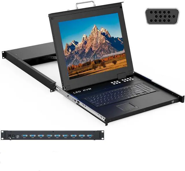 Rack VGA KVM with 17" LCD monitor fits into 19" 1U rackmount, space saving and easy to use. Supplied with metal rails, perfect for network cabinet/ server rack up to 23.5"-31.5" (600-800mm) deep.