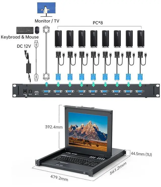MT-VIKI Rack KVM Monitor VGA Switch 8 Port allows you to control 8 computers simultaneously shared ONE screen. It supports a 2-level daisy chain/cascade, enabling the control of up to 64 computers.