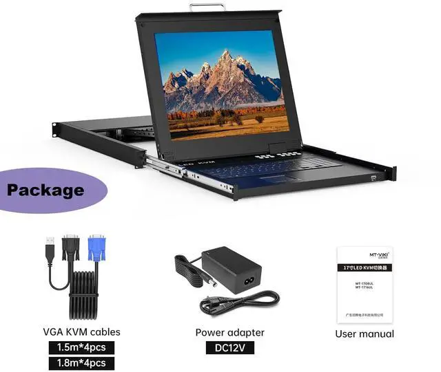 What's you get: 1*17'' LCD KVM Console VGA 8 Port, (4*5'+4*6') USB VGA KVM Cable, 1* Power Supply, 1* User Manual.