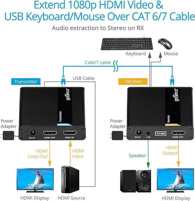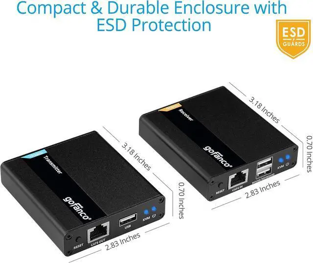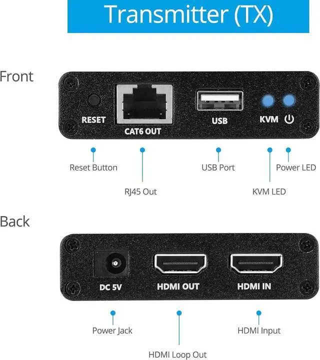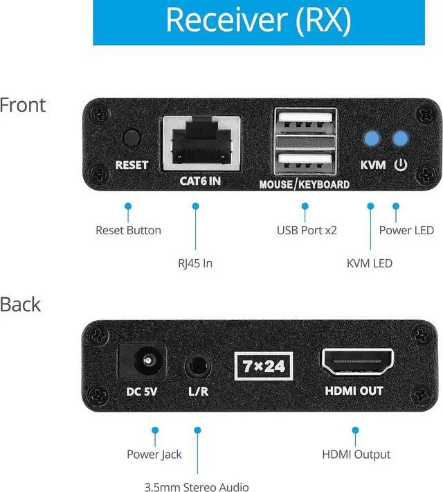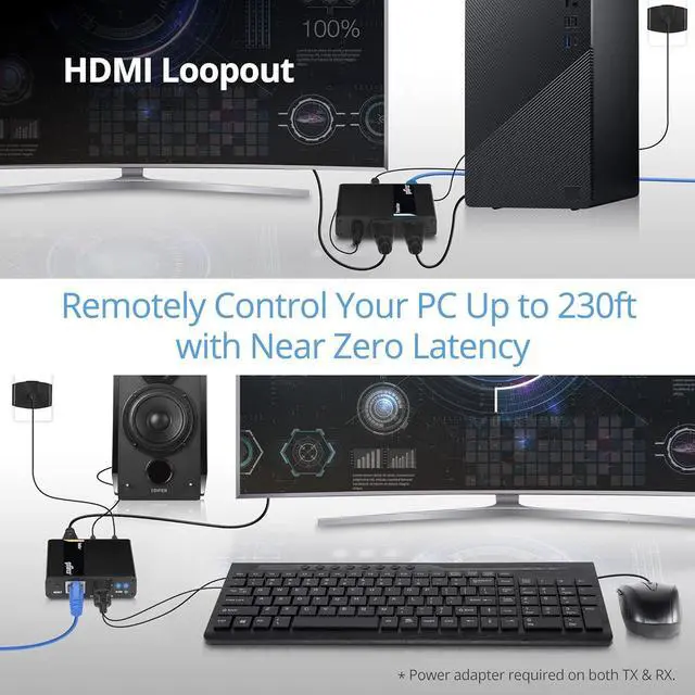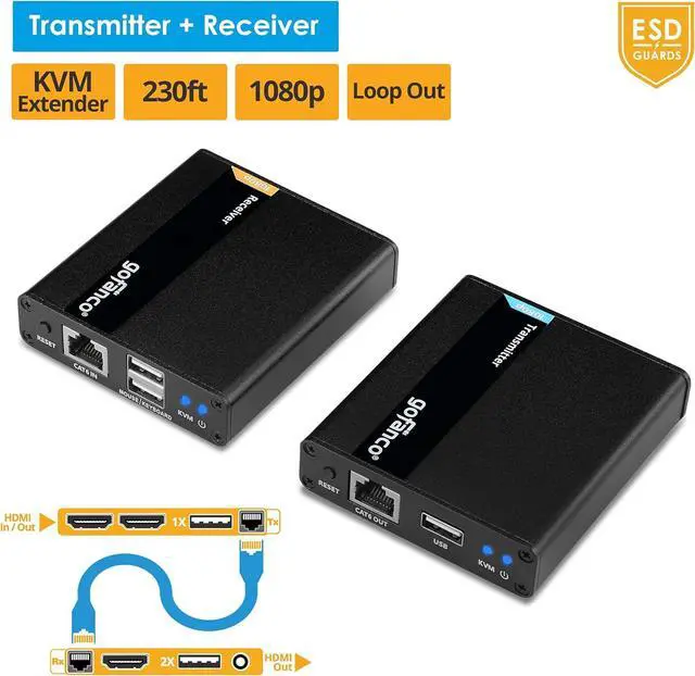 KVM EXTENDER Extend USB Keyboard, Mouse, and HDMI video signals up to 230ft (70m) over CAT6/7 cable. *Good quality CAT cables are essential in delivering quality content.