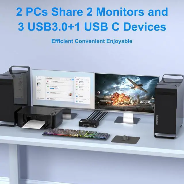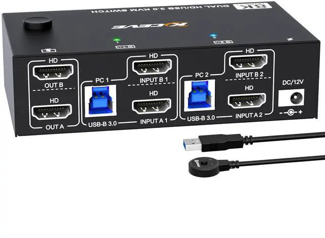 HDMI KVM Switch 3 3.0 + USB C s Dual monitor KVM switch allows 2 computers share 2 monitors and 4 USB devices,which can recognize keyboard, mouse, printer, scaner, USB flash drive and other USB devices. :Need to connect the USB cable included in the package to the USB port of PC1/PC2 and the computer, otherwise the USB device will not be recognized.