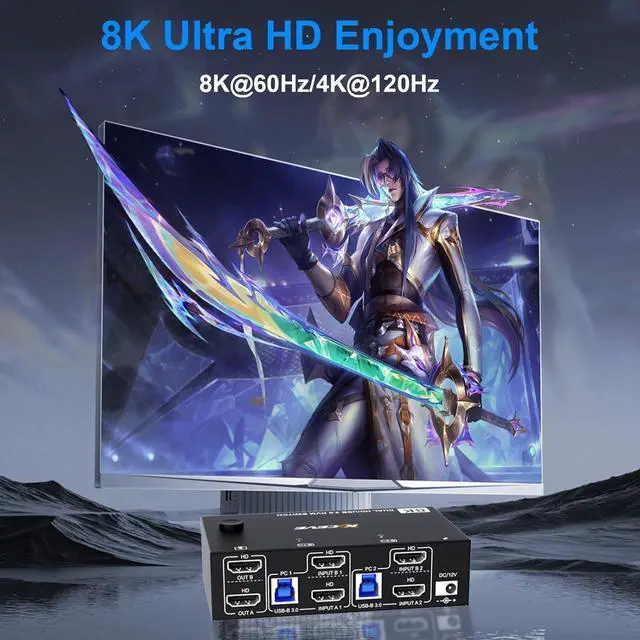 8@60Hz/4K@120Hz KVM Switch Dual Monitors KVM Switch supports resolution up to 8K@60Hz/4K@120Hz, backward compatible with lower resolution.Note: Final resolution is also subject to graphic cards, monitors, cables and adapters.