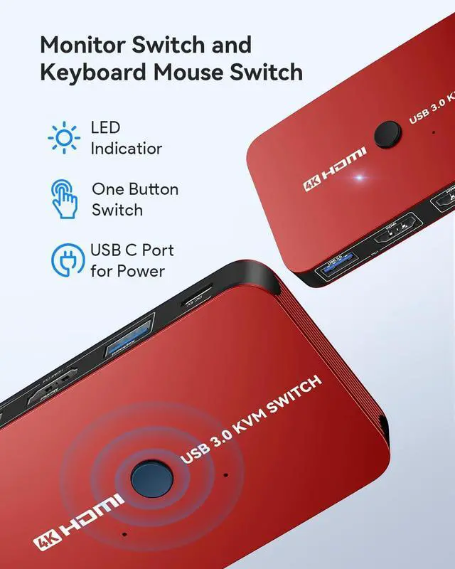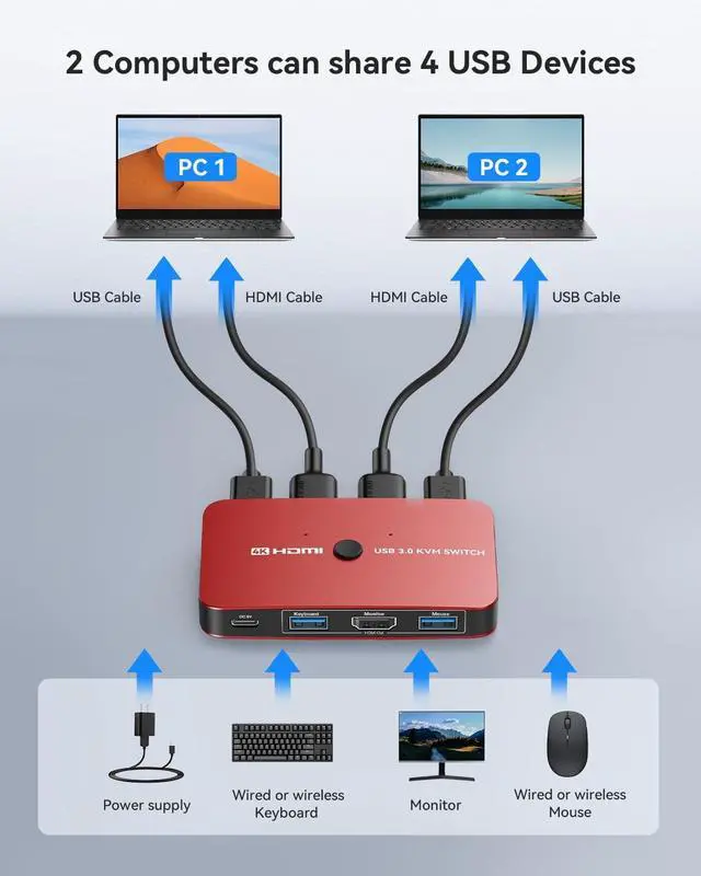 USB KVM HDMI Switch BoxThis HDMI KVM Switch allows you to control 2 computers with only one set of USB devices (Monitor, Mouse, Keyboard and Printer). You can easily switch between two displays with one button-pressing,it is not only a monitor switch but also a keyboard mouse switch.