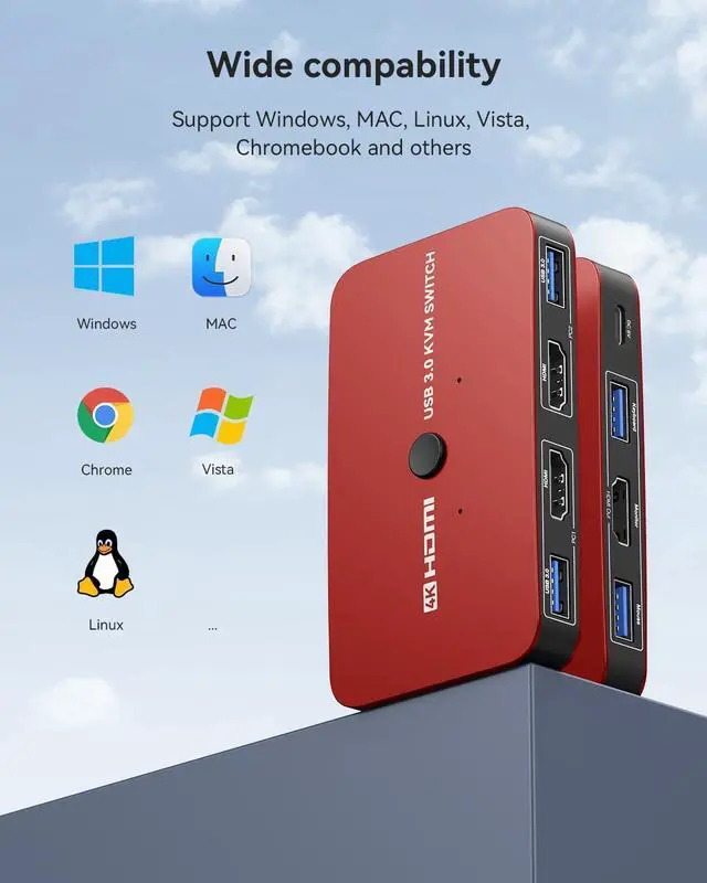 Easy Switch & Greater Compability Easily switch between 2 displays with a single click on the button or wired controller. This KVM switches works with greater compatibility(we have updated the usb ports to usb 3.0-which improve the data transfer stability), driver-free for Windows 10/8/8.1/7/Vista/XP and Mac OS, Linux, and Chrome OS, simply plug and play, No external power required.