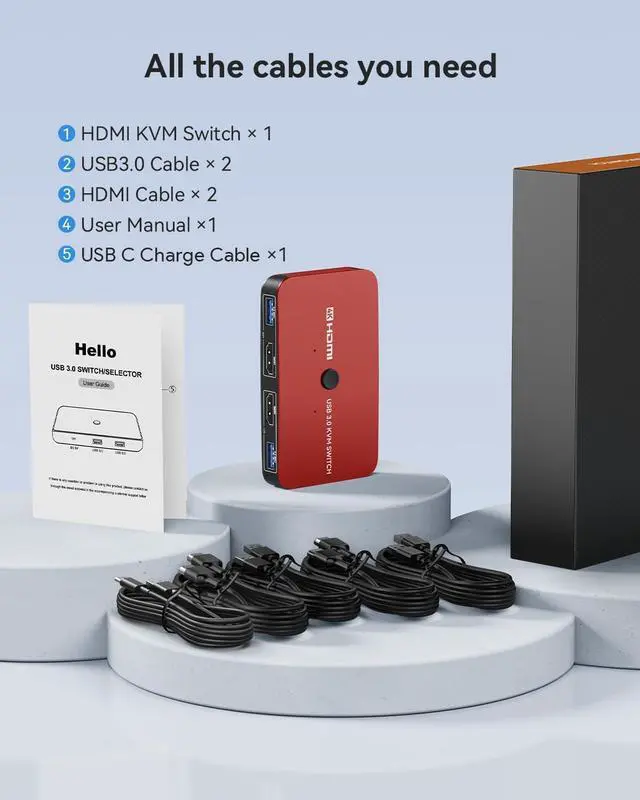 Package and WarrantyOur kvm switches comes with 2 pack 100cm(3.28ft) hdmi cable and 2 pack 120cm(3.94ft)usb 3.0 cables,no need to spend extra money on cables.What You Get: 1*KVM Switch, 2*HDMI cable, 2*USB 3.0 Cable, 1*User manual,If any issue,please contact us to solve,we provide 24-month warranty and 24h professional customer service and technical support.