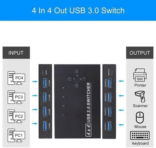 Enables efficient workspace management by letting 4 users or hosts share 4 peripheral devices reducing clutter and improving desk organization
