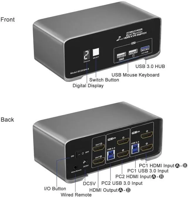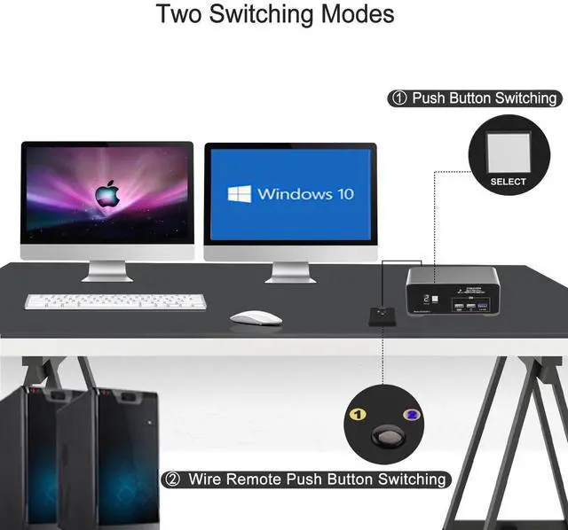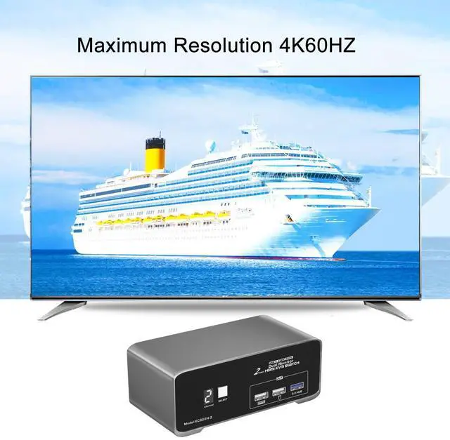 USB3.0 HDMI KVM Switch 2 Port - The 2-Port USB3.0 HDMI KVM Switch enables two HDMI-equipped PCs to share share 2 monitors, a keyboard, and mouse, facilitating effortless switching between systems. It helps declutter your workspace and maintain a neat, organized environment.