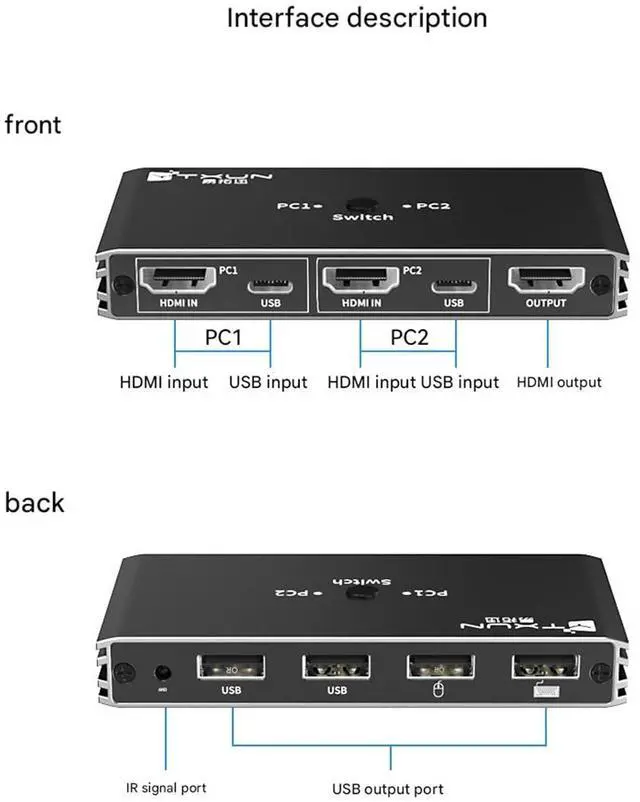 2. 2 In 1 out HDMI KVM switch 4K is compatible with HDMI 1.4 and HDCP 1.4, supports resolution up to 4K@30Hz