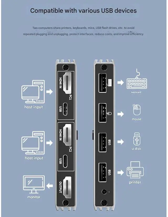 4. HDMI 2 ports KVM switch adaptive EDID/HDCP decryption,can adapt to a variety of complex application environment.