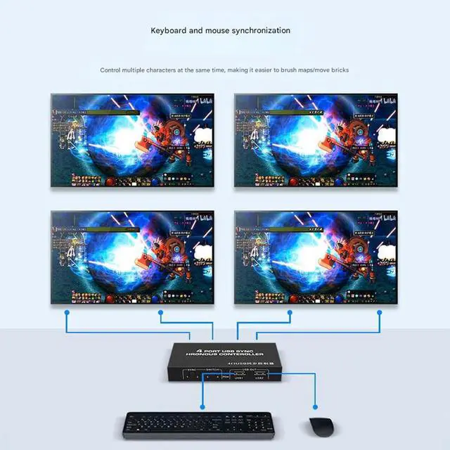 Synchronizer Function: The synchronizer's USB interface enables 4:1 free switching or synchronous 4-port control with one button. As a synchronizer and KVM switch, you can conveniently and quickly switch between hotkey mode and synchronizer key mode.