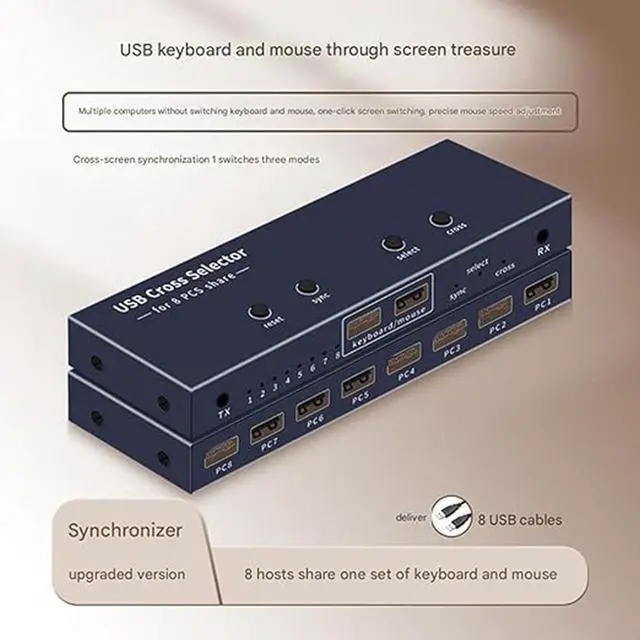 • Synchronizer Function: The 2/4/8-port USB interface realizes 2/4/8 free switching synchronous control. As both a synchronizer and a KM switcher, You can switch between hotkey mode and synchronizer button mode, which is convenient and quick.