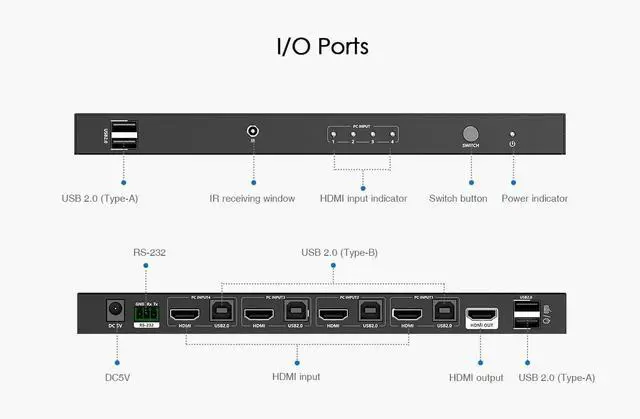 4K HDMI 4:1 KVM Switch with Remote Control The KVM switch allows you to connect and control up to 4 servers or PCs via HDMI monitor and USB keyboard and mouse.