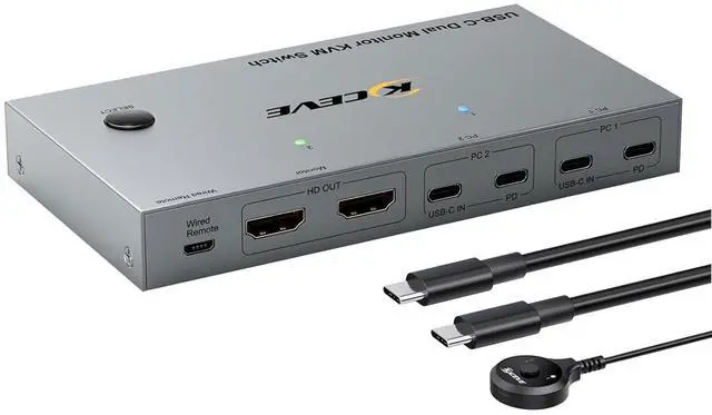 80W PD Fast Charging & 2 Switching MethodsKCEVE USB C KVM switch charges your laptop during work. This KVM switch USB C HDMI provides up to 80W of PD fast charging for your laptop via its PD port (requires your own PD 100W adapter). Switch between your two computer in seconds using the KVM laptops panel button or included 1.5m wired remote. An LED clearly indicates the active source