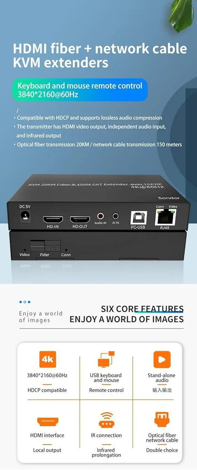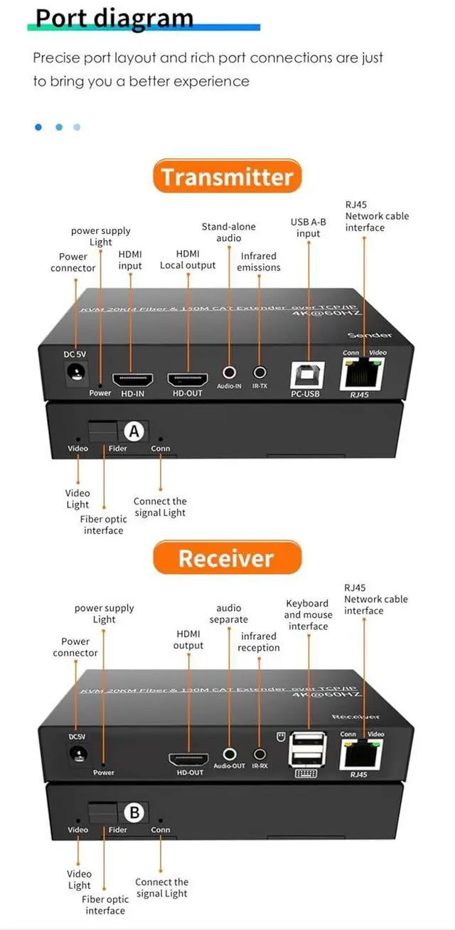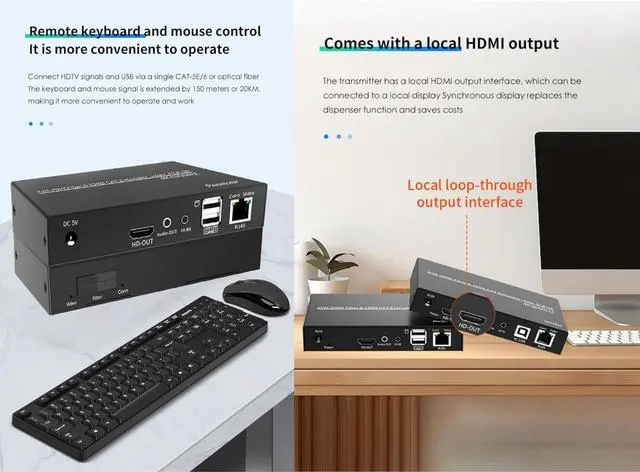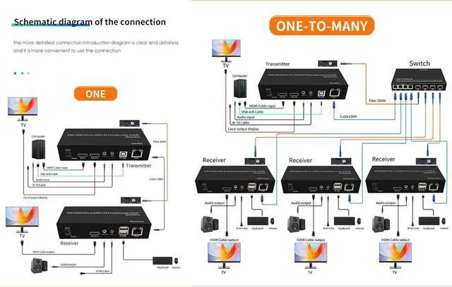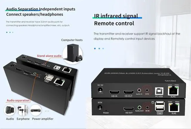 E:Plug-and-play convenience: No additional setup required when used in pairs. The transmitter features HDMI video output, independent audio input, and infrared output, while the receiver supports audio output and infrared input, ensuring simple operation.