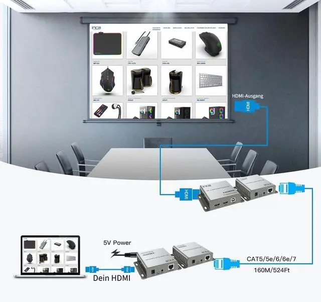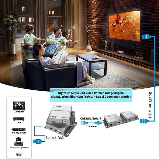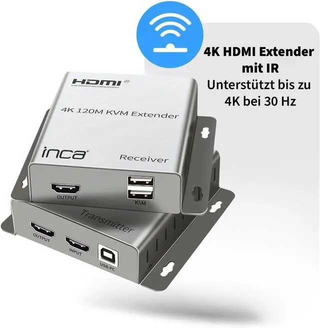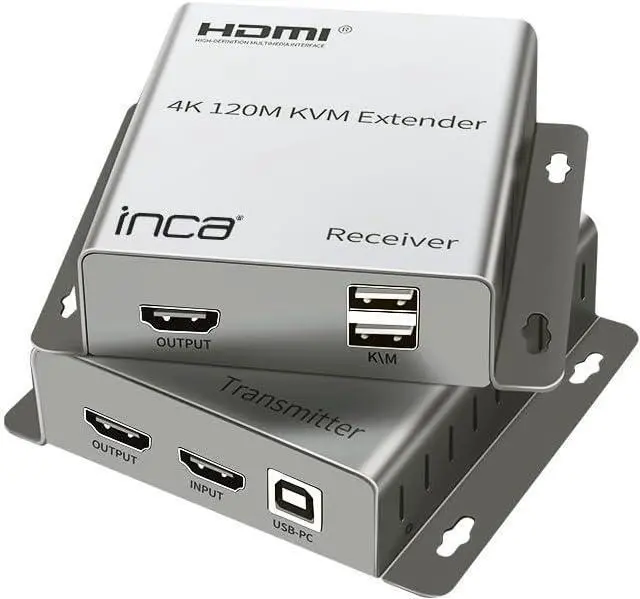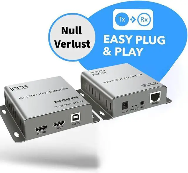 Wide compatibility and uses - HDTV formats 4K/1080p/720p/576p/480p; works with PCs, workstations, Blu-ray players, set-top boxes, NVR/DVR, monitor, TV, projector. The inca IEX-120 is supplied as a set (transmitter + receiver, power supplies, manual) and addresses professional applications such as data center, production, retail signage, education and control rooms reliable, scalable and installation-friendly.