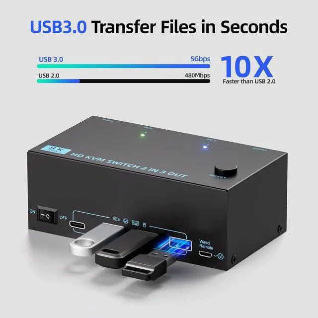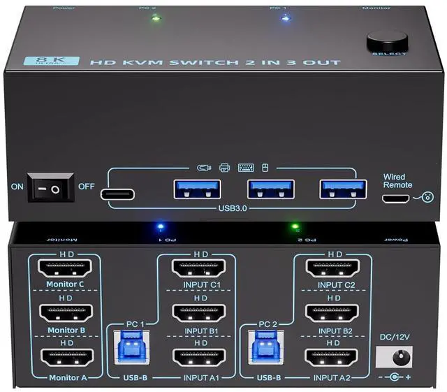 8K Triple Monitor KVM Switch:This triple monitor KVM switch perfect for hooking up 2 desktops to share one set of keyboard mouse and 3 monitors (supports extended and mirrored display modes).