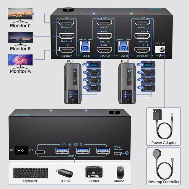 3 USB3.0-A + 1 USB C Ports:3 monitor KVM switch allows 2 computers share 3 monitors and 4 USB devices,which can recognize keyboard, mouse, printer, scaner, USB flash drive and other USB devices.2 Switching Methdos: Triple monitors KVM switch driver-free and plug and play. you can press the button on the panel or use the wired remote controllerincluded in the package to switch the computers.Two color lights indicate the active computer.