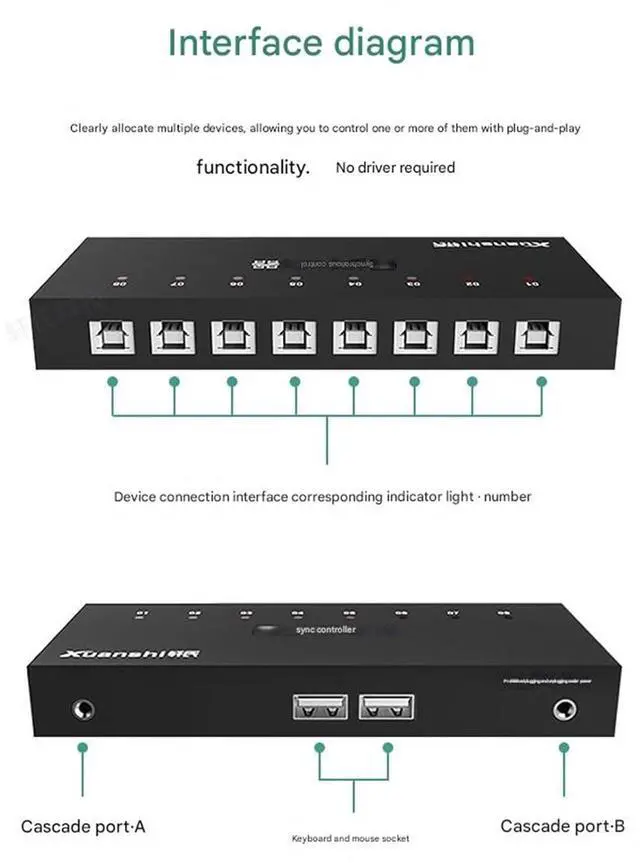 Synchronizer FunctionThe 48-port USB interface realizes 48 to 1 free switching or one-button 48 port synchronous control. As both a synchronizer and a KM switcher, You can switch between hotkey mode and synchronizer button mode, which is convenient and quick.