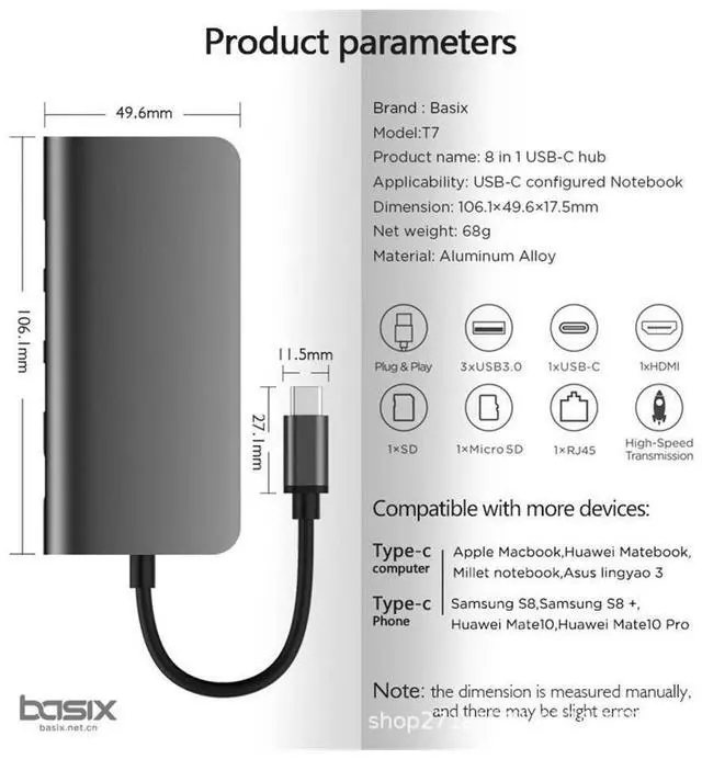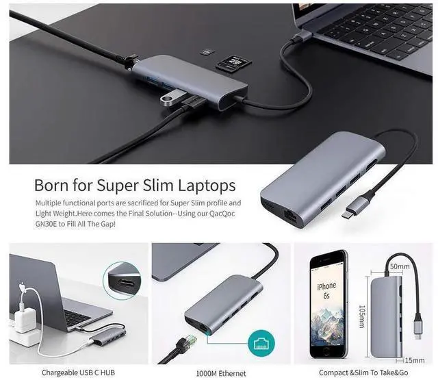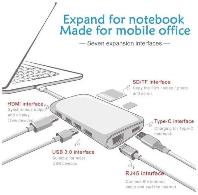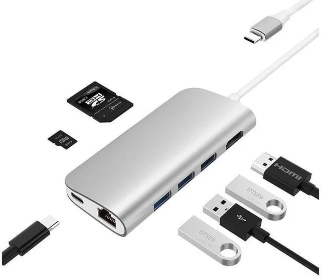 Hub Adapter: Premium 8-in-1 USB C Hub adapter solution with huge versatility and functionality. 3 USB ports 3.0 male-to -female and are USB 2.0 compatible, 1 USB C 4 K to HDMI port, 1 RJ 45 1Gigabit Ethernet port 1 USB C Hub female-to-male USB C port. 1 SD Card reader slots 1 TF Card reader slots