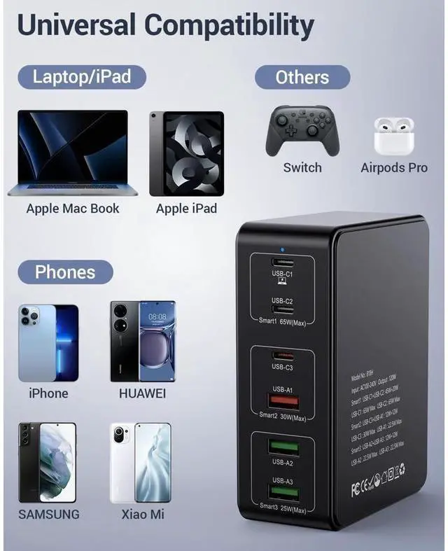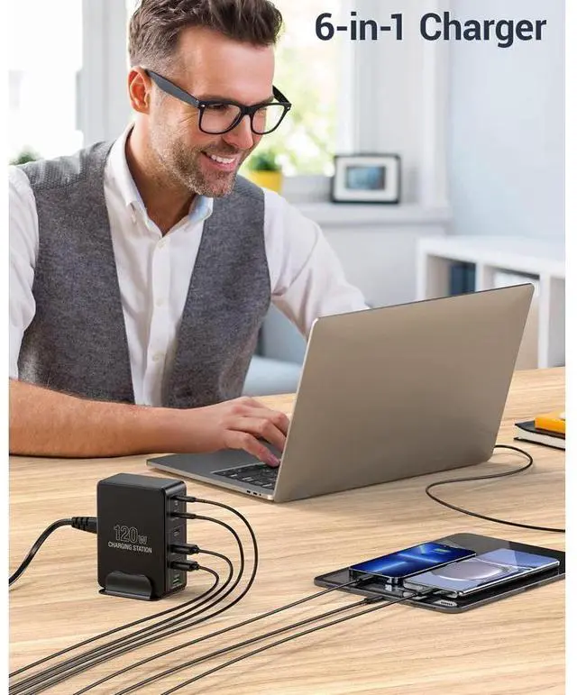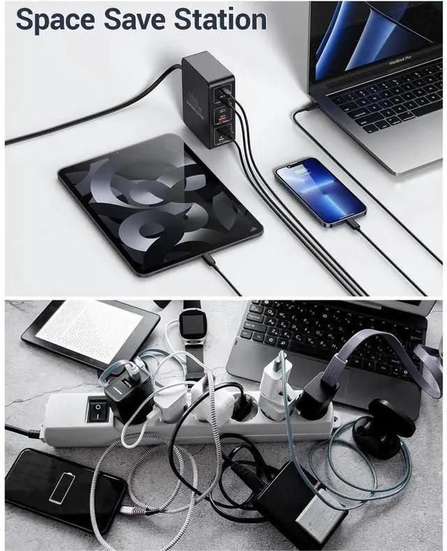 Multiport usb charging station with 3 USB-A QC 3.0 ports, 3 USB-C PD 3.0 ports; 65W x 2 USB C port when used independently, providing full speed PD charging for loptops. Themultiple usb charging stotion supports 6 devices uSB fost chorging ot the some time. worldwide 100V-240V AC input voltage, compoct and tight design makes the usbcharging stotion covenience and portobility handy for home, office, and travel.