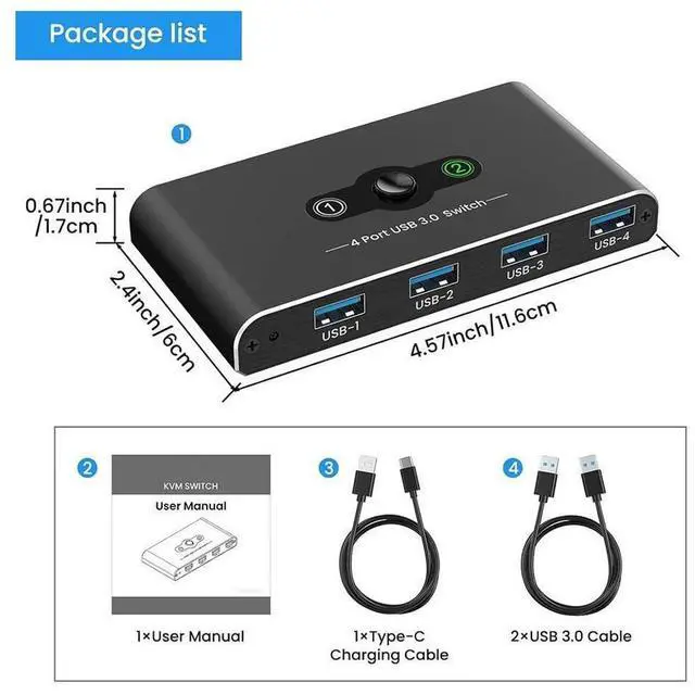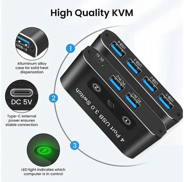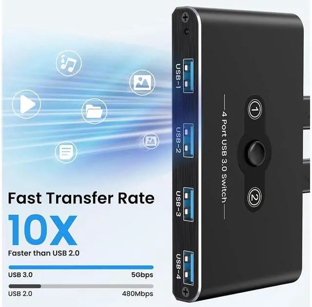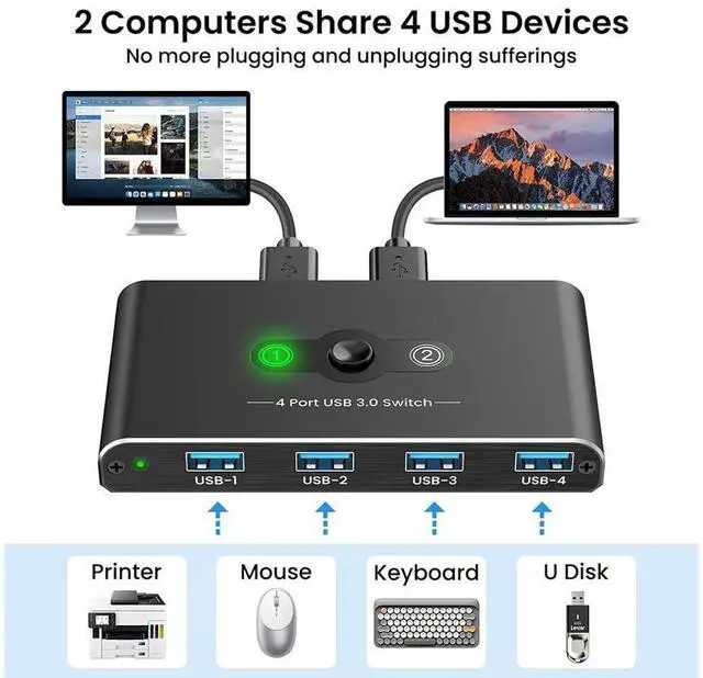 The USB 3.0 switch allows 2 computers to share 4 USB peripherals, making it easy to switch between PCs with the press of a button.